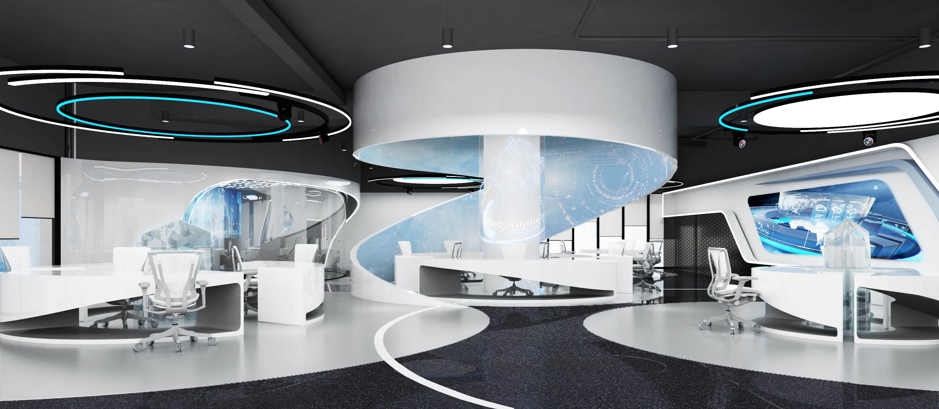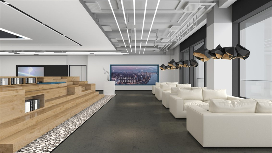設(shè)計(jì)介紹:主要展示前臺(tái)、洽談區(qū)、走廊、貴賓區(qū)、會(huì)議室、辦公區(qū)等各個(gè)區(qū)域?qū)嵨飯D,設(shè)計(jì)師們采用現(xiàn)代簡(jiǎn)約風(fēng)格辦公室設(shè)計(jì),主要以白色為主,藍(lán)色更符合智能化科技的公司形象,通過(guò)幾何圖形與條紋裝飾打造科技智能的辦公空間。