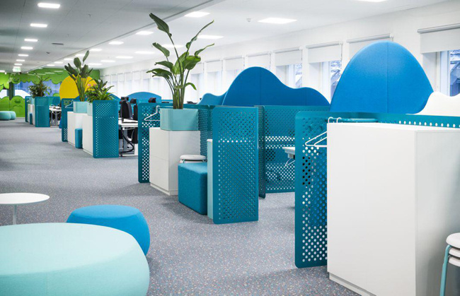 4、動(dòng)漫公司辦公室裝修:以一個(gè)開放式的辦公環(huán)境為宗旨,旨在培養(yǎng)員工的團(tuán)隊(duì)協(xié)作能力和溝通能力,而隨處可見的沙發(fā)座椅大大方便了員工之間的溝通交流。放松心情的辦公氛圍也使得靈感隨時(shí)都有可能迸發(fā),公司員工能夠享受到以任何自己喜歡的方式進(jìn)行靈感的創(chuàng)作。除了主要的工作區(qū)域,辦公室的其他功能區(qū)也各具特色。以天然綠色為背景的圖書館能夠?yàn)閱T工提供寧靜安逸的閱讀空間,另外還有包括蹦床、球類等讓員工可以盡情玩樂游戲室,閑暇之余聊天放松的咖啡廳。而餐廳的設(shè)計(jì)有吸引力,將餐廳設(shè)計(jì)成一個(gè)復(fù)古的美式游樂園,搖椅或旋轉(zhuǎn)木馬般的座位,極具童心童趣。